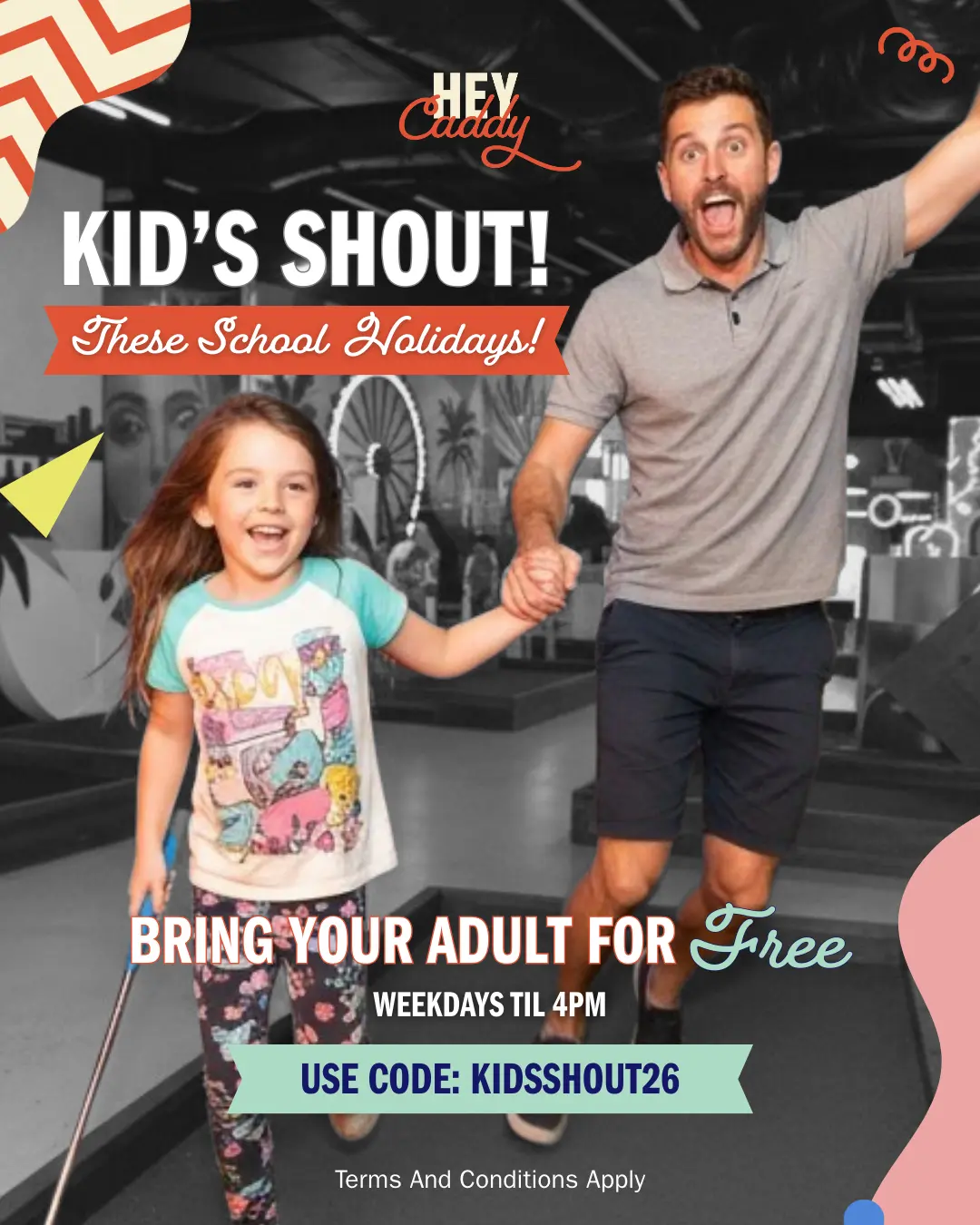 Even better — Adults Play Free with any kids booking at Hey Caddy (week days til 4pm, online bookings only). It’s the perfect all-weather activity for families, groups and friendly competitions these holidays.