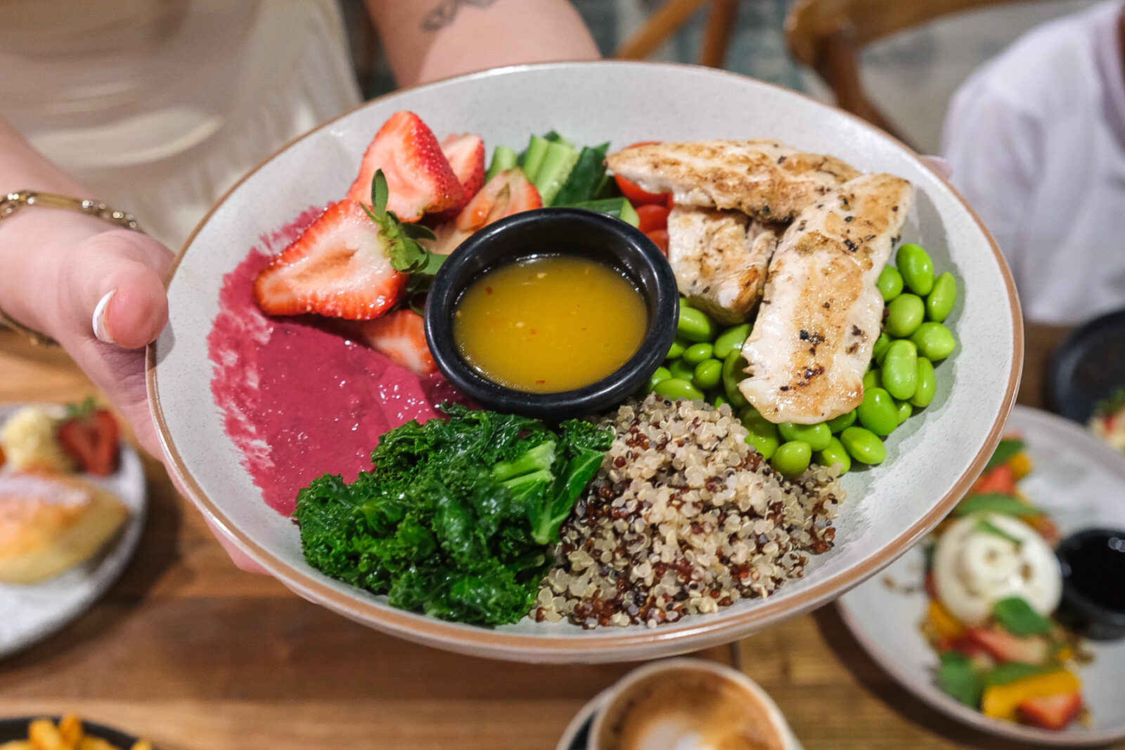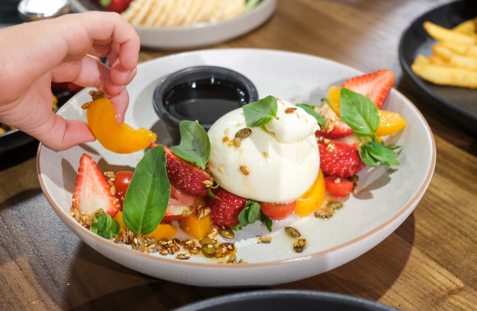 - Strawberry & Burrata Salad – almost too pretty to eat. With peaches, cherry tomatoes, basil, Beerenberg Orange Marmalade, toasted seeds, and pomegranate dressing, this salad is a masterpiece of freshness and colour.