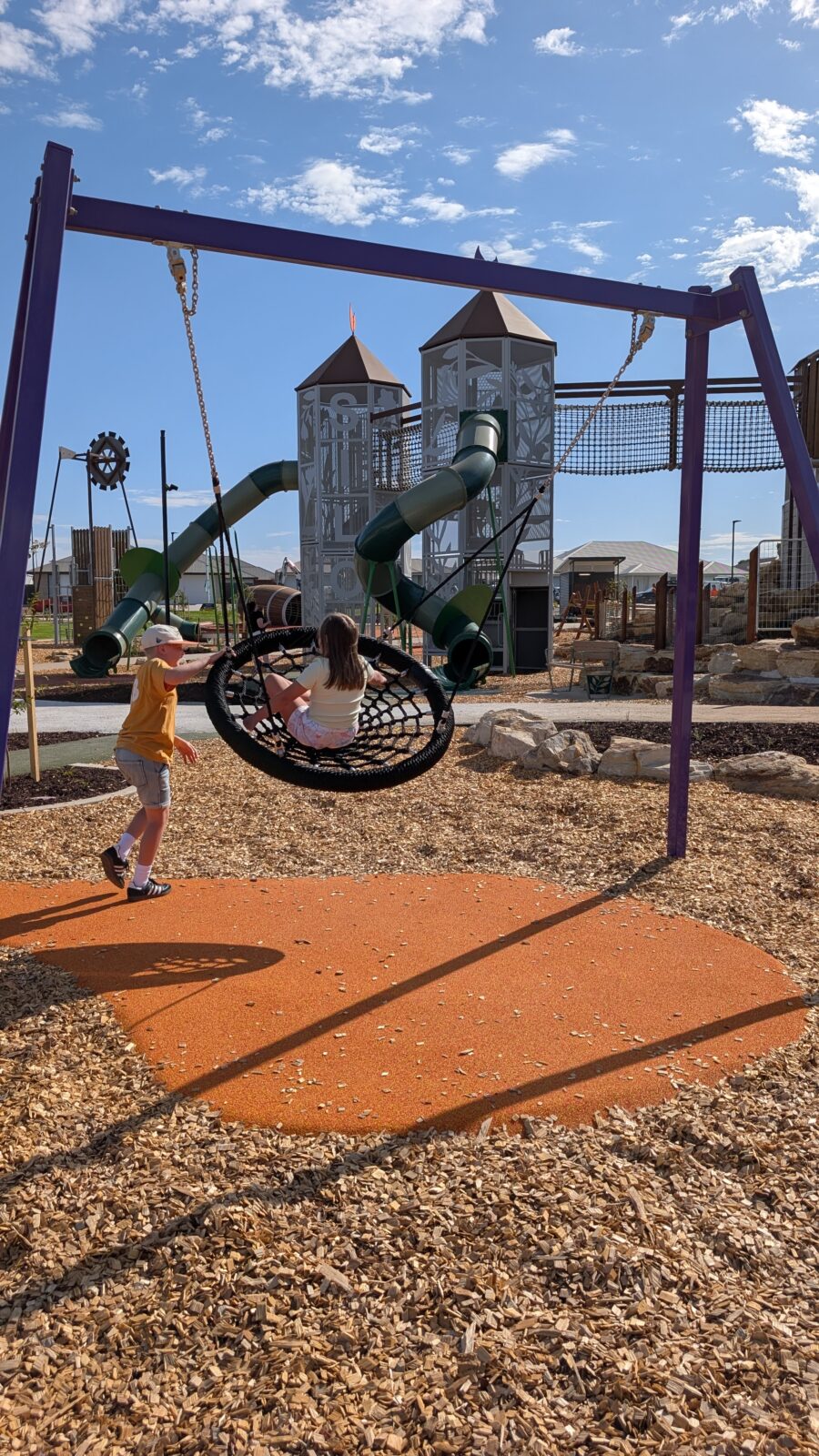 There are shelters, seating, and large grassy areas making it easy to stay and play a little longer. The park also includes bike racks, trees and soft plantings, and toilet facilities, making it a comfortable spot for families of all ages.
