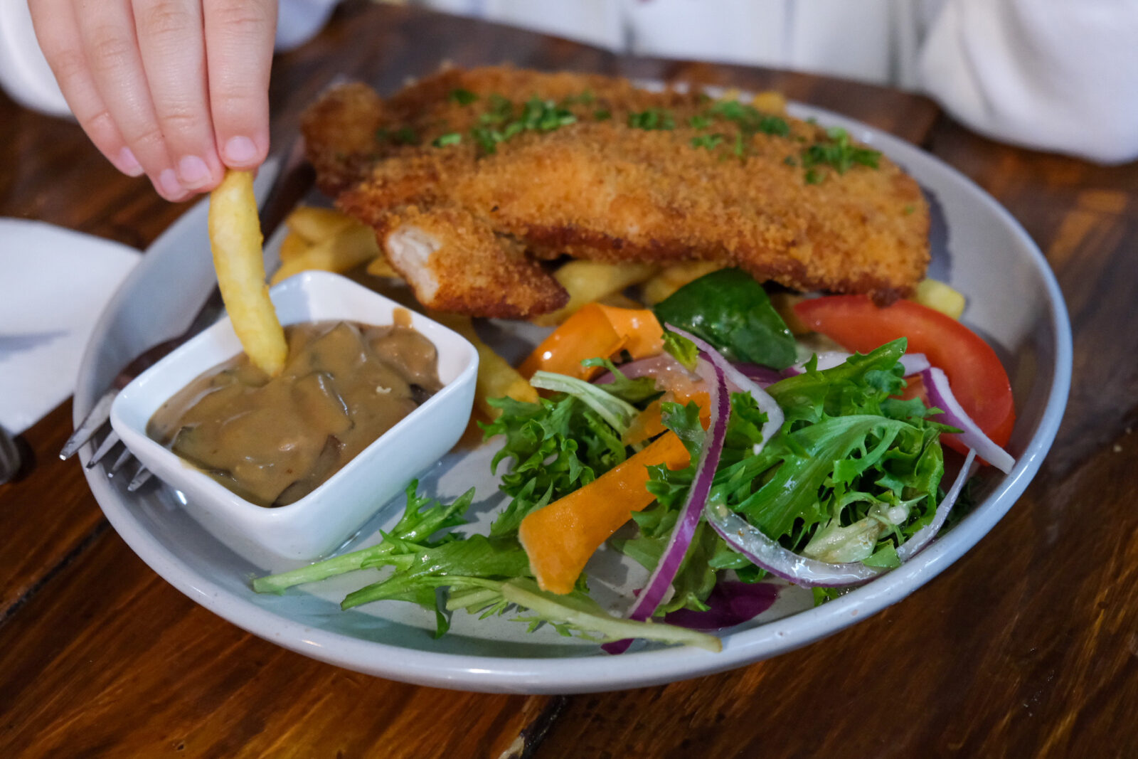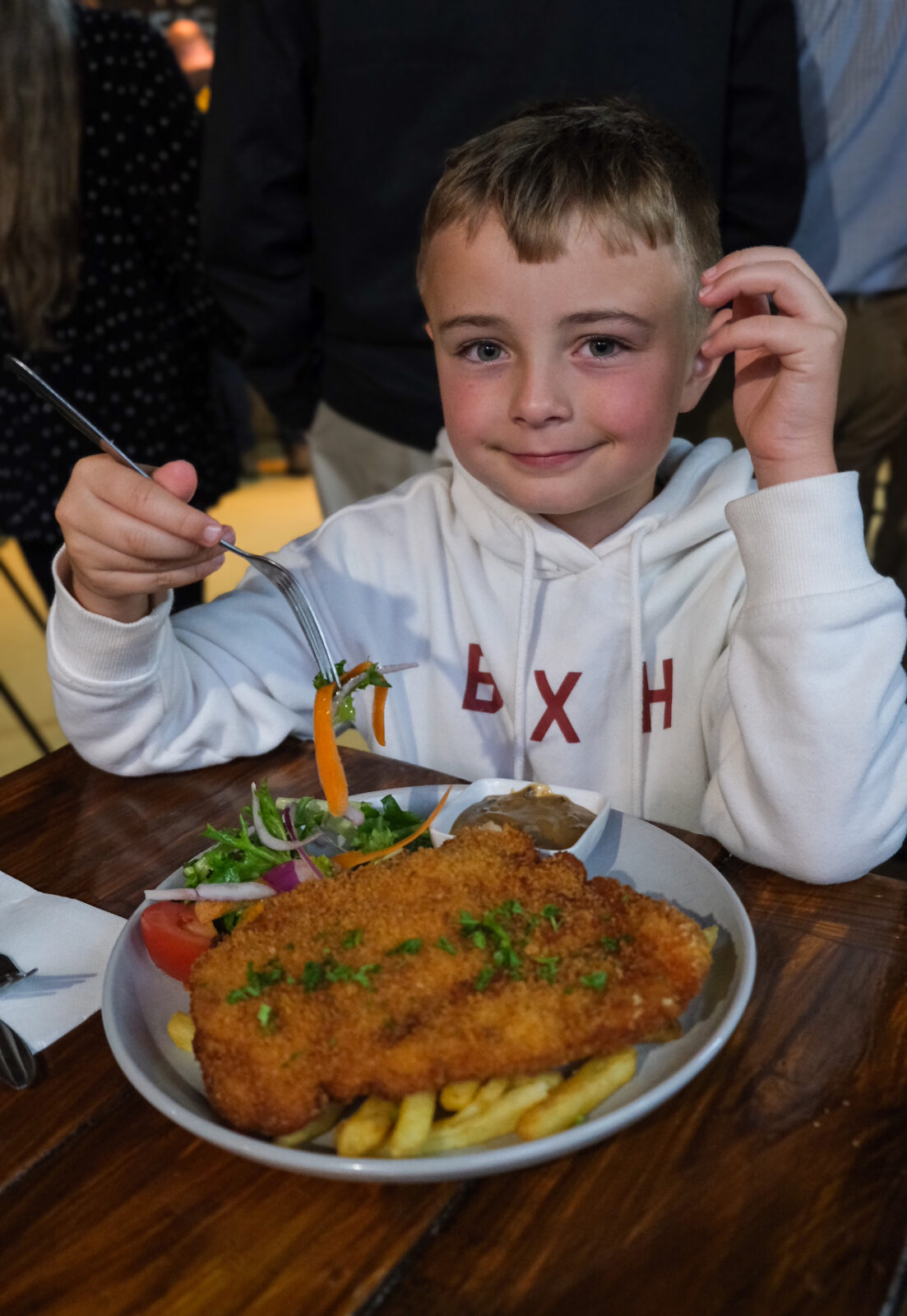 The menu is good old Aussie comfort food, the kind you actually want after a day exploring the Riverland. Big, hearty serves, loads of local produce and plenty of options for both grown-ups and kids. Our meals were honestly so good. The kids’ menu has all the favourites… nuggets and chips for my six year old, which disappeared in about three minutes flat. My eight year old went for the chicken schnitzel with mushroom sauce and reckons it was the best he’s ever had. My partner had the Reef and Beef, I went with the Chicken Bianco, and we were both super happy with our choices. The serves are huge, so definitely bring your stretchy pants. And if you can fit it in, order dessert. The menu changes each week and everything we saw heading out of the kitchen looked ridiculously good.