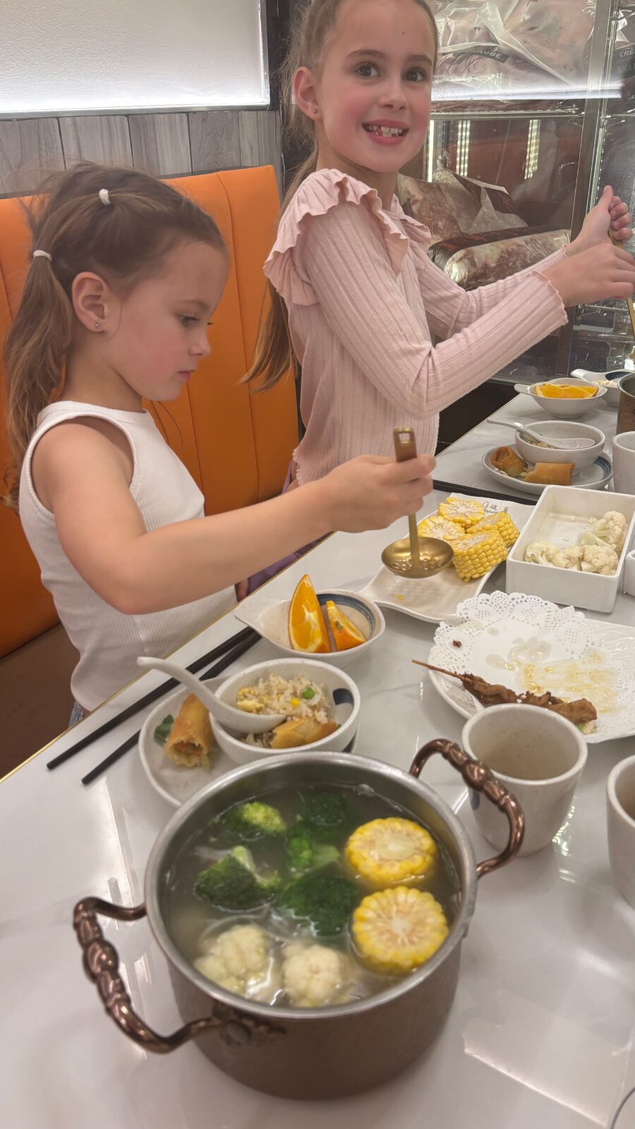 Hot pot is an interactive, much cherished and currently on trend, traditional Chinese dining experience where you cook your meal right at the table, and yep, kids love getting involved! First, you choose your broth (we went with a delicious chicken coconut base, the chicken here is for flavour, so you’ll still choose your own proteins) and then add your selection of meats, veggies, and noodles. We tried beef, corn, broccoli, cauliflower and noodles, which bubble away in the fragrant broth until ready to eat. There’s also a sauce bar with endless flavour options like chilli, garlic, and soy, so you can make every bowl your own. For something extra, we highly recommend their entrees and found the spring rolls, chicken skewers, and fried rice were all winners with our crew.